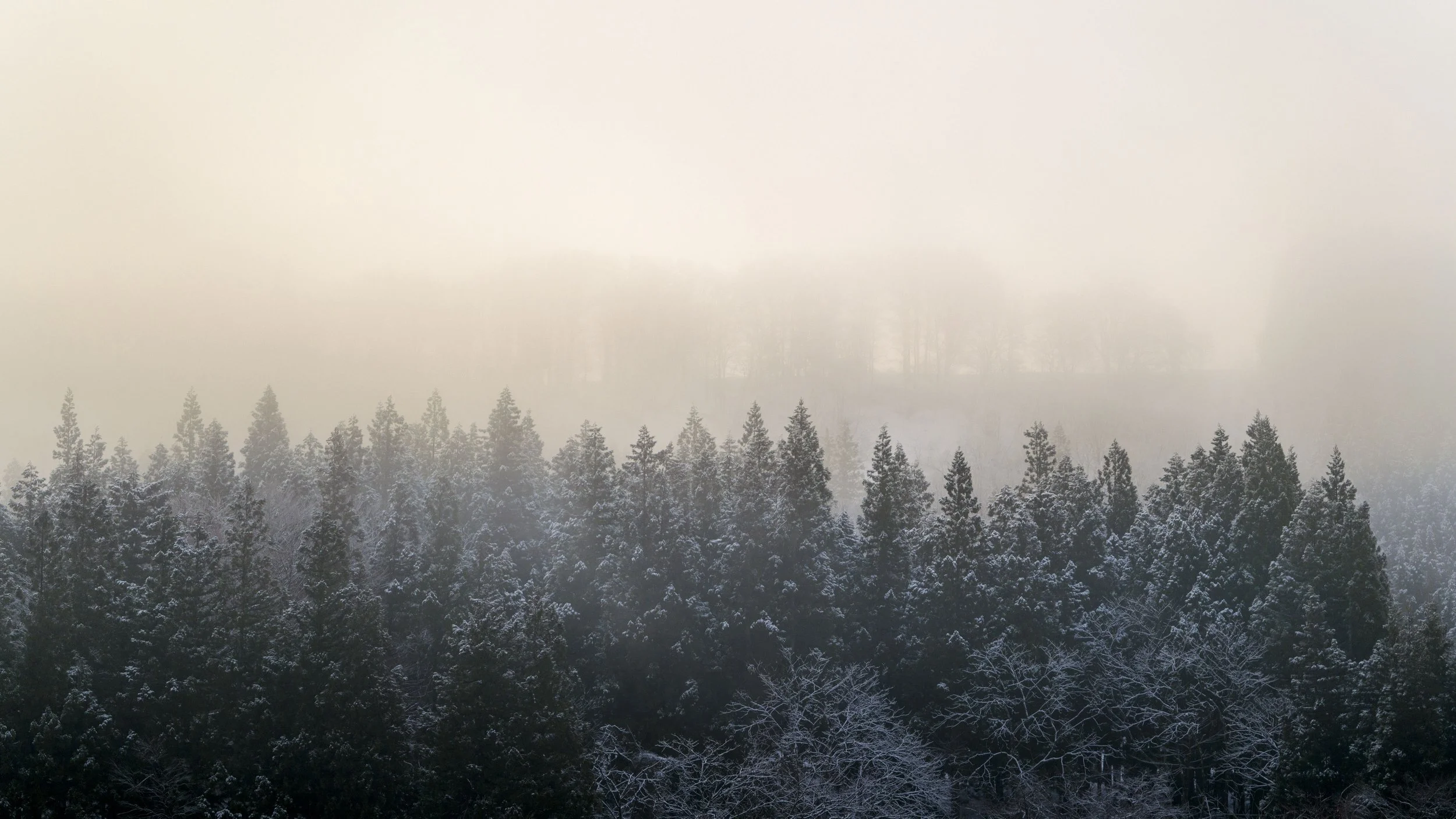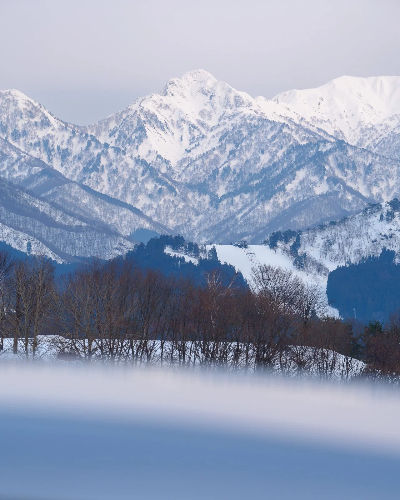 One of the pictures at the gallery was made on a winter morning in the Tokamachi area. Snow held to the tops of the trees, and a pale fog folded the background into silence. I had to stop the car quickly — not because it was dramatic, but because it was about to be gone. That’s the joke with landscapes: they look like they’ll wait for you, and they never do. Sometimes you catch it. Most times, it’s already gone.